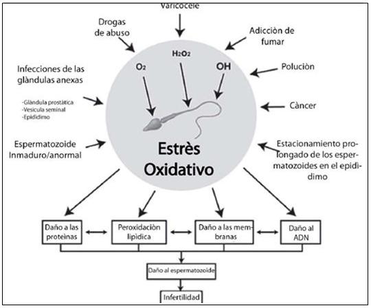 Los espermatozoides son más vulnerables a ROS que otras células porque sus membranas tienen más ácidos grasos poli-insaturados. Una exposición prolongada a ROS produce peroxidación lipídica alterando la estructura de los receptores de proteínas, enzimas y proteínas de transporte; y provocando la fragmentación del ADN espermático (Fraczek y Kurpisz, 2005).